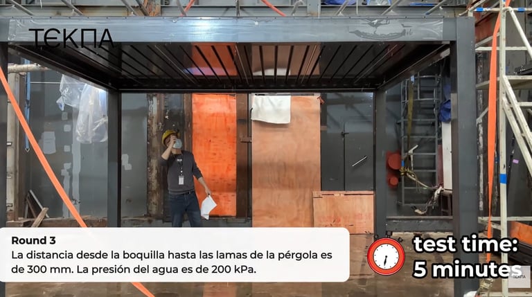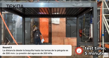Ensayo de resistencia a la lluvia realizado por Intertek sobre pérgola TEKNA, sometida a lluvias intensas sin filtraciones, verificando la estanqueidad del sistema.