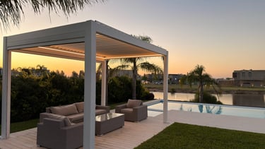Te mostramos una pérgola bioclimática automática TEKNA de 4 X 3 m, instalada en Terralagos, Canning, junto al solárium y la pileta, con una vista abierta a la laguna.