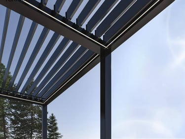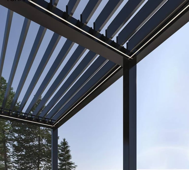 Gracias a sus lamas orientables motorizadas y iluminación LED integrada, el espacio se transforma en un ambiente elegante y confortable durante todo el día.