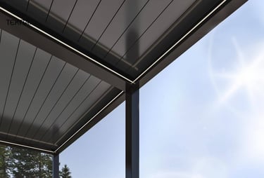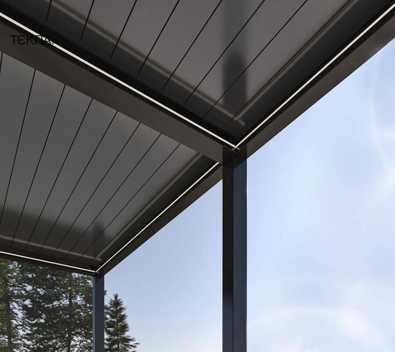 La Pérgola TEKNA Automática es una estructura bioclimática de aluminio diseñada para brindar confort y protección en espacios exteriores. Fabricada en aleación 6063-T6 con recubrimiento en polvo AkzoNobel, ofrece alta durabilidad y cero mantenimiento. Sus lamas orientables se accionan mediante control remoto, además, incorpora iluminación LED integrada con diferentes opciones de color.